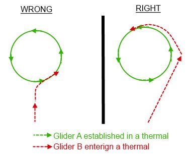 - Come in on tangent lines so that even if you are matching an existing glider you can give him room on the inside and then slide in behind him. Many pilots like to enter like the diagram on the left which if timed wrong can throw off the pilot already there. Instead show intent and take an obvious tangent line like on the right. Pilots in the thermal are given time to spread out and give you the room you need to work in.