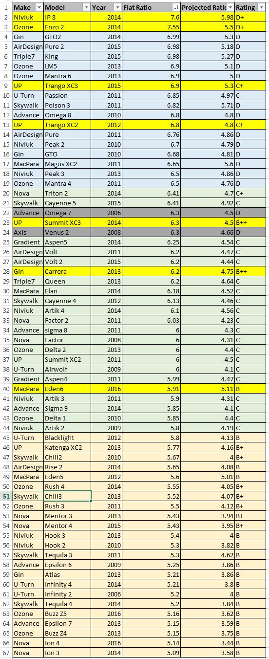 To support some of what I'm saying, here is a quick spreadsheet I made of glider ratings and aspect ratios. I added a + or ++ to the rating if I considered it a cheater glider that deserved to be in a higher category then it's actual rating. A caveat here being that most manufacturers make a low and high end EN-B glider these days so all high end EN-Bs I gave a '+', the '++' rating for those EN-Bs show the true outliers