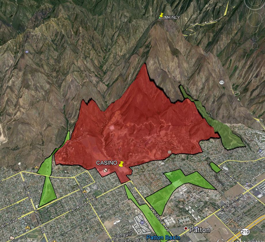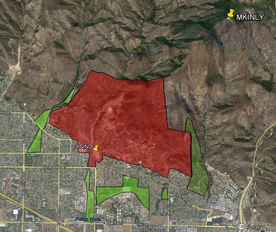 - The main restriction to the East is the San Manuel Reservation. They have asked pilots not to land here but since McKinley, directly behind the reservation is such a key trigger it can be stressful to go low into this area. Best bet is to fly slowly over the lower terrain and tank up before hititng McKinley. If you don't find a thermal at McKinley and are sinking out, push out to Walmart or East to a bailout just past the reservation. See the jpg and kmls linked at the top for landing details. Putting a 1.63km radius cylinder around 34.149465, -117.220980 will keep you outside of reservation land. This cylinder extends much further South than actual reservation land and is only meant as a guide for LZs over deeper terrain.
